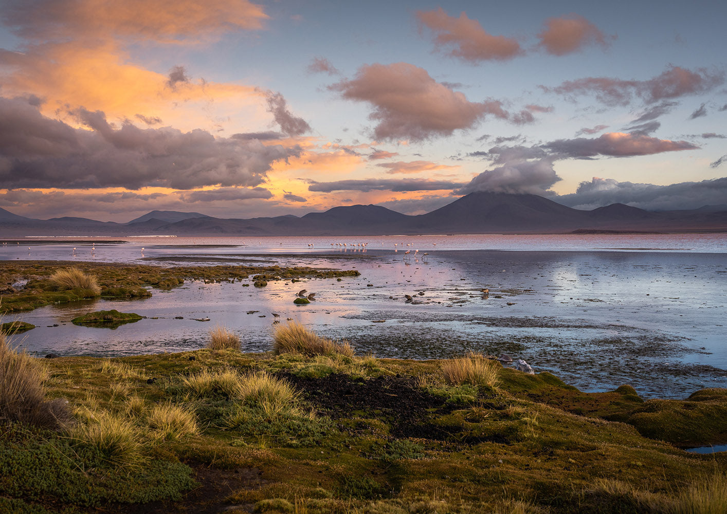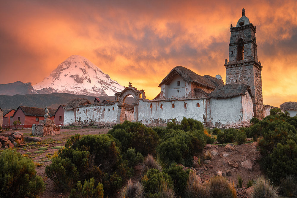 Sonnenuntergänge an Lagunen, Berghängen oder Kirchen mit Blick auf chilenische Vulkane und dem Sajama.