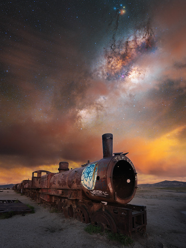 Sonnenuntergang und Astrofotografie am Eisenbahnfriedhof in Uyuni.
