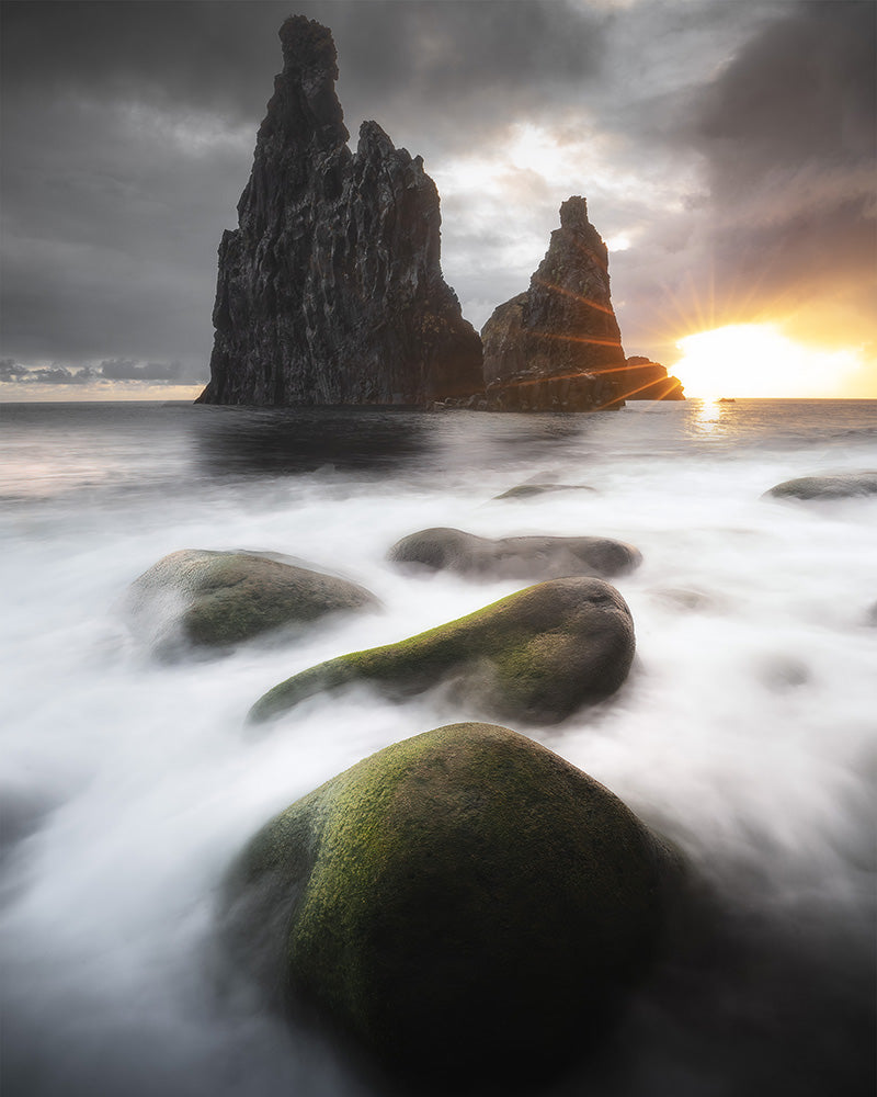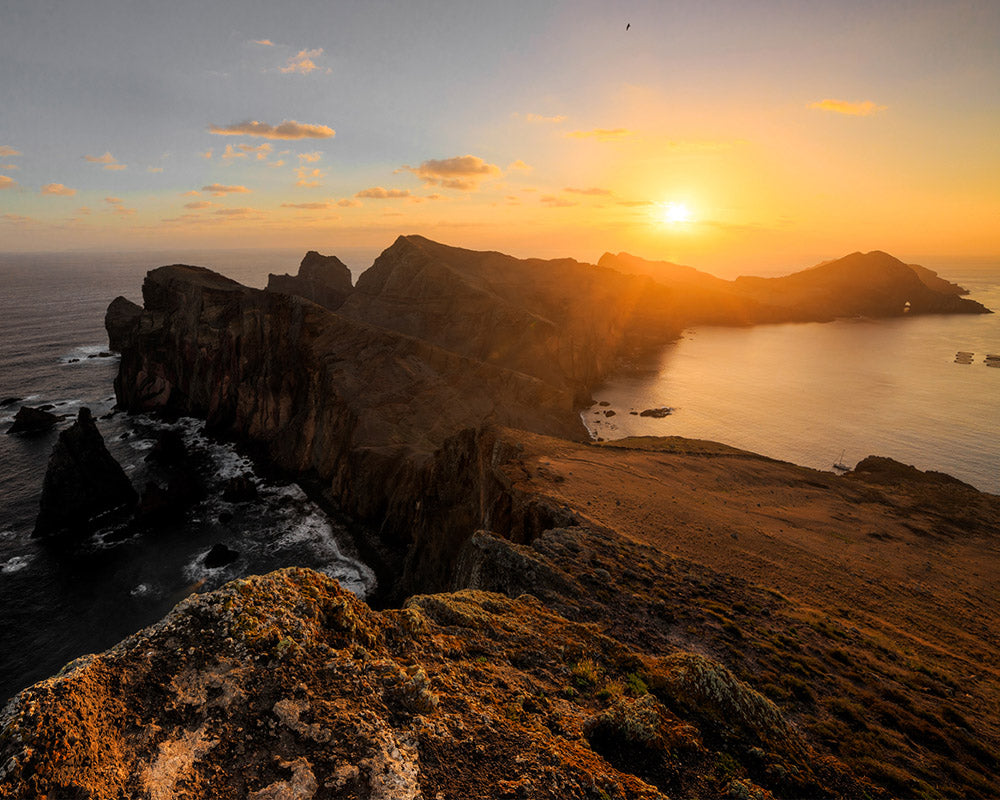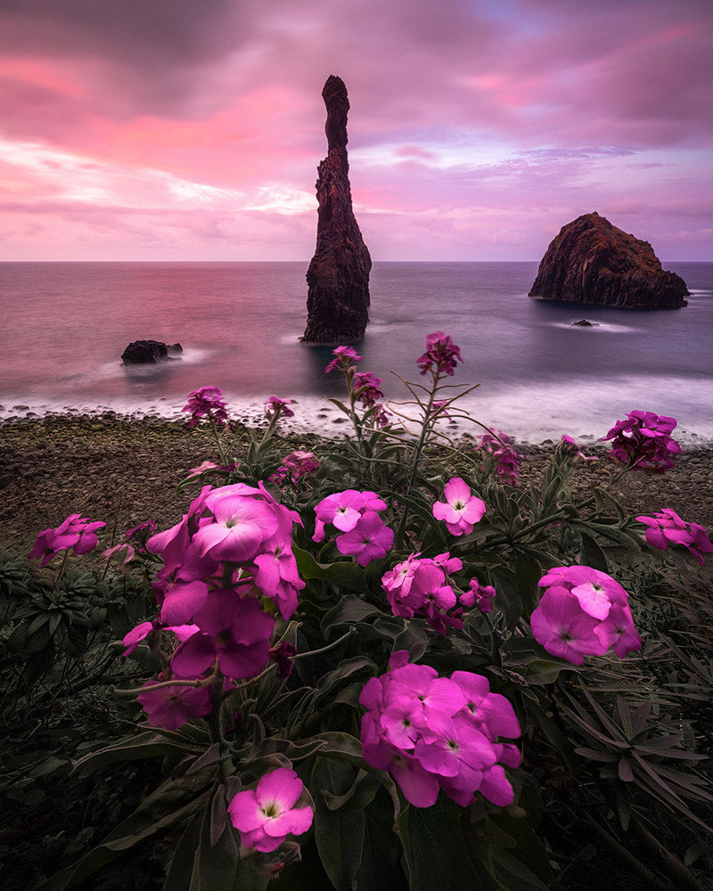 Sonnenaufgang an der Praia da Ribeira da Janela, wo wir darauf warten, dass die Sonne zwischen den Felsen, zwischen Blumen und einem ins Meer fließenden Fluss durchscheint.