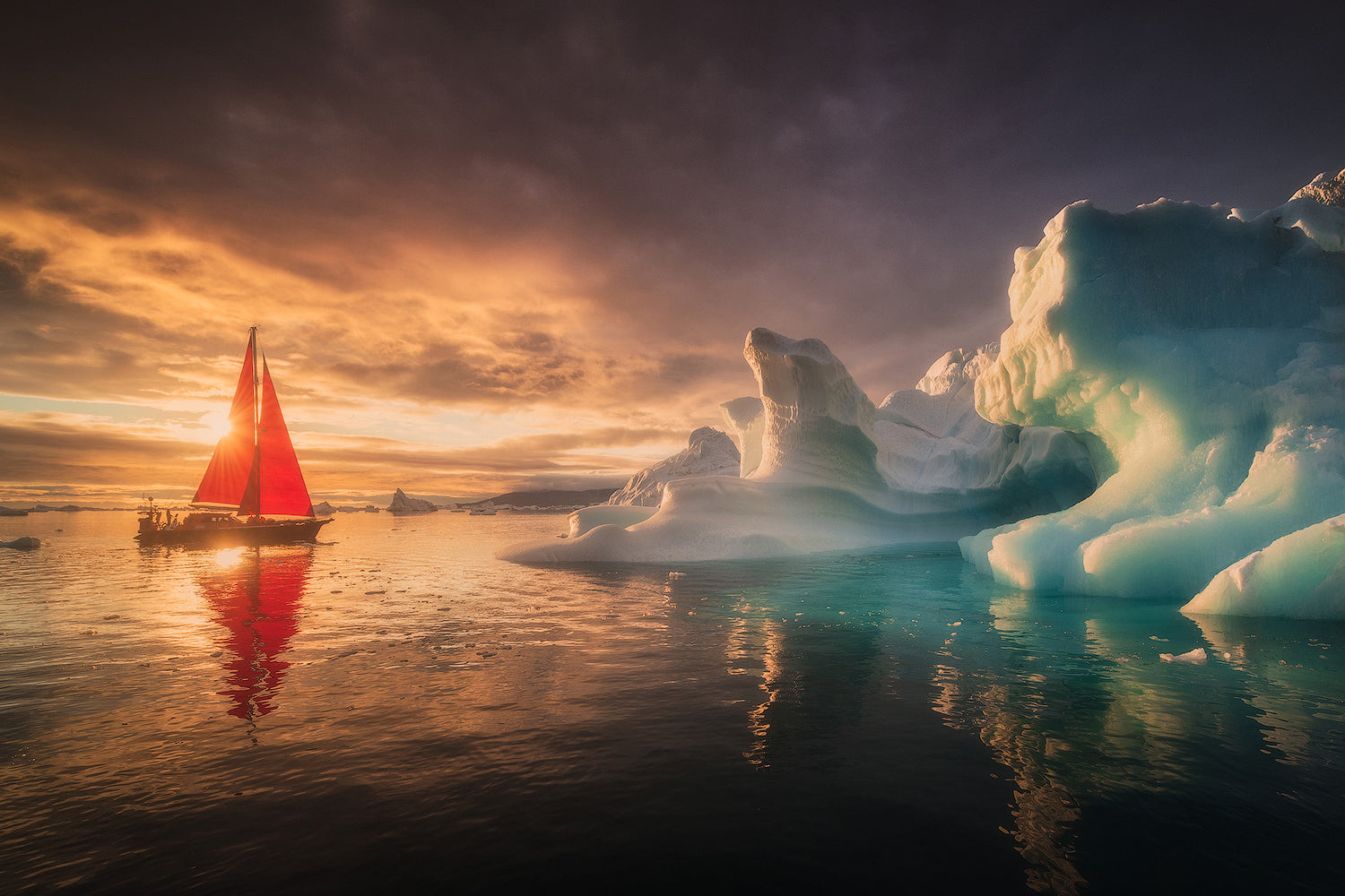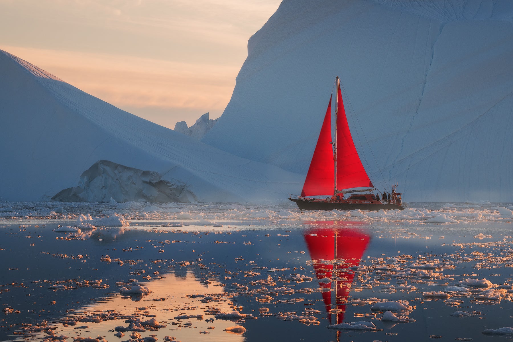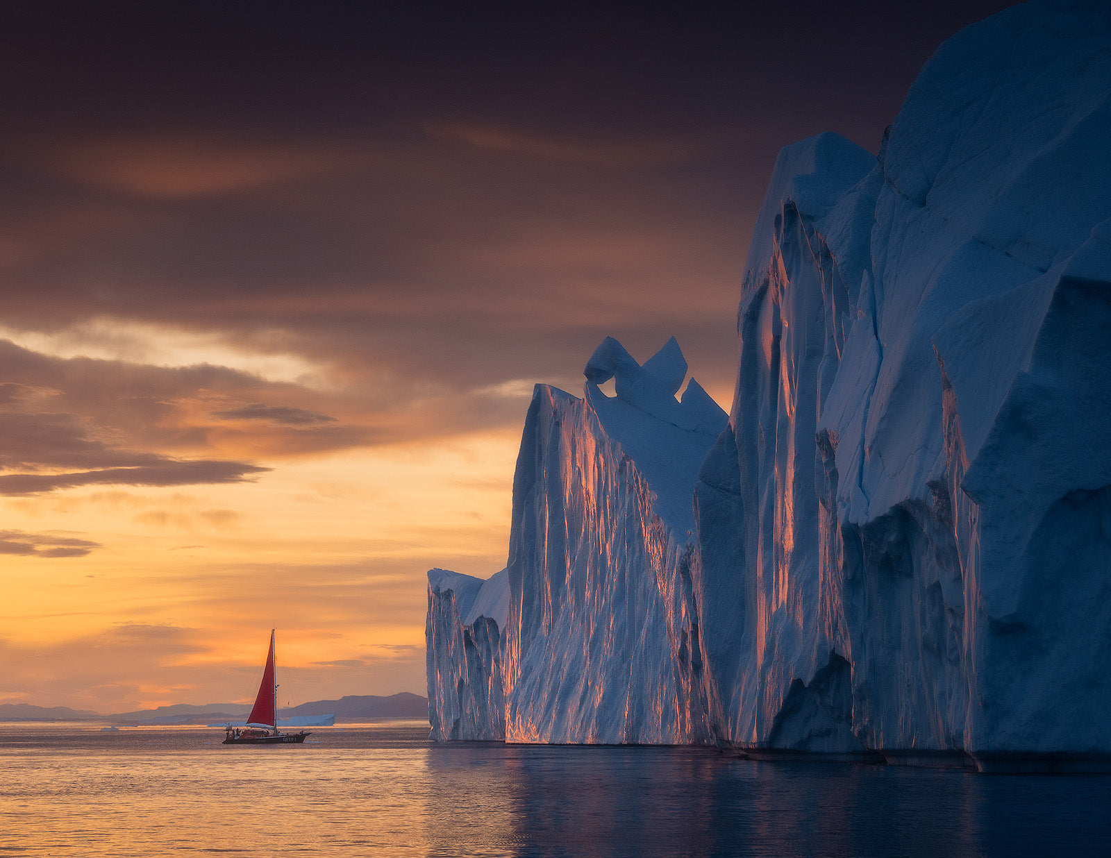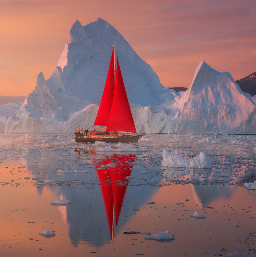 Die Dörfer Grönlands sind schlecht durch Landwege miteinander verbunden. Hier bieten die natürlichen Wasserwege die besten Routen. Aus diesem Grund werden wir für unser gesamtes Abenteuer ein privates Segelboot chartern. Die Kombination aus leuchtend roten Segeln und der eisigen Umgebung schafft einen starken visuellen Fokus. Auf unserer Reise werden wir mehrere grönländische Siedlungen besuchen, darunter Qasigiannguit, Aasiaat und Oqaatsut.